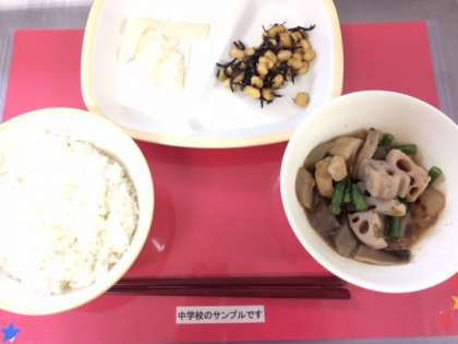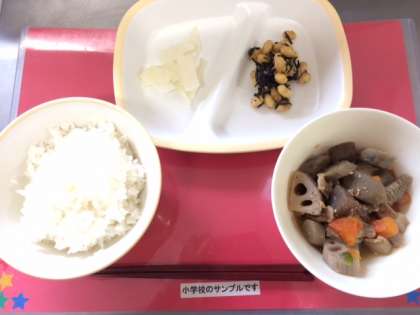 今日の給食は、小中ともに【ご飯、筑前煮、ひじき豆、だいこんのゆず風味、牛乳】です。
