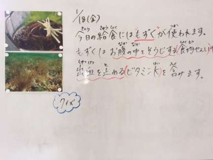 1月18日(金)、今日の給食には「もずく」が使われます。もずくは、お腹の中をそうじする[食物せんい]や出血を止める[ビタミンK]を含みます。