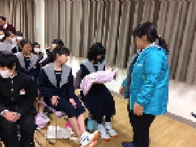 実際の赤ちゃんと同じように作られた「赤ちゃん人形」を抱く体験もしました。慣れない手つきで抱いている生徒もいましたが、不思議と抱いているときの生徒たちの表情は「優しい表情」になっていました。