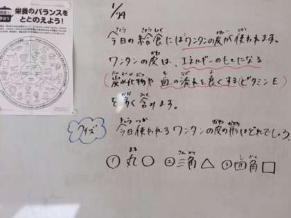 1月24日(木)、今日の給食には「ワンタンの皮」が使われます。ワンタンの皮は、エネルギーのもとになる[炭水化物]や血の流れを良くする[ビタミンE]を多く含みます。