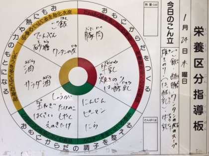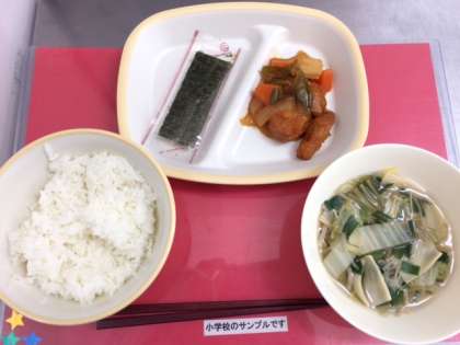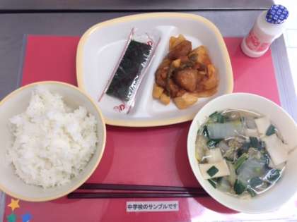 今日の給食は、小学生は【ご飯、酢豚、ワンタンの皮のスープ、焼きのり、牛乳】、中学生は【発酵乳】が加わります。