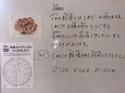 1月28日(月)、今日の給食には「しめじ」が使われます。しめじは、お腹の中をそうじする[食物せんい]や血液をサラサラにする働きがあります。