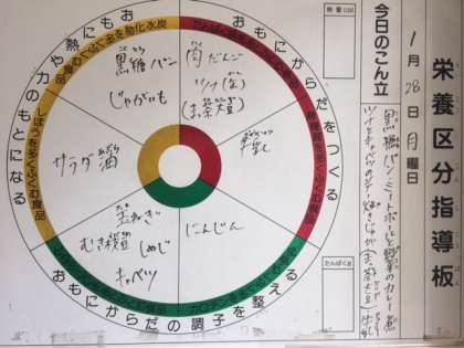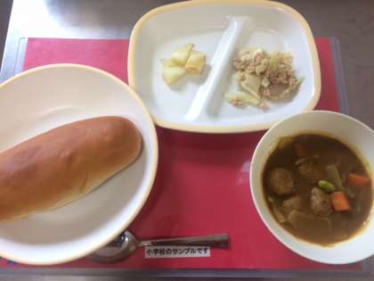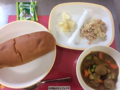 今日の給食は、小学生は【黒糖パン、ミートボールと野菜のカレー煮、ツナとキャベツのソテー、焼きじゃが、牛乳】、中学生は【抹茶大豆】が加わります。