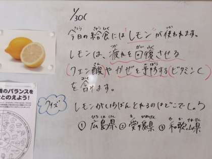 1月30日(水)、今日の給食には「レモン」が使われます。レモンは、疲れを回復させる[クエン酸]やかぜを予防する[ビタミンC]を含みます。
