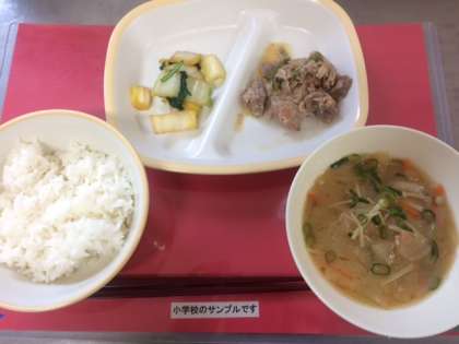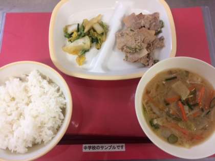 今日の給食は、小中ともに【ご飯、豚肉のごまだれ焼き、みそ汁、きくなとはくさいのおひたし、牛乳】です。