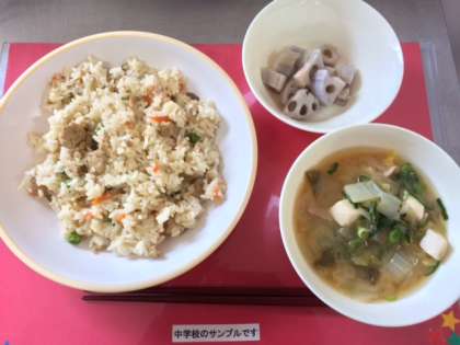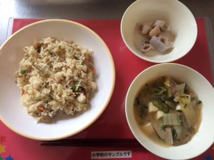 今日の給食は、小中ともに【鳥ごぼうご飯、干しずいきのみそ汁、焼きれんこん、牛乳】です。