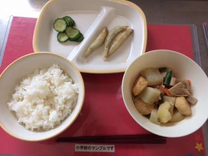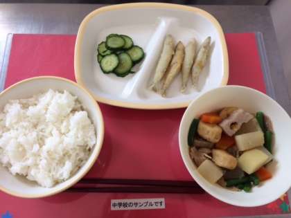 今日の給食は、小中ともに【ご飯、きびなごのてんぷら、あっさりきゅうり、一口がんもとだいこんの煮もの、牛乳】です。