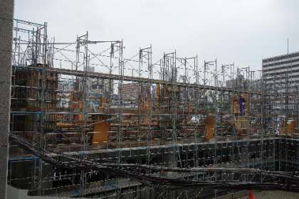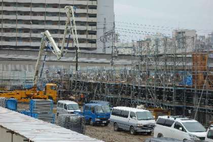 さて、2階部分の作業は進んできているようです。コンクリートを流し込む車も来ています。工事は盆休みもなさそうです。