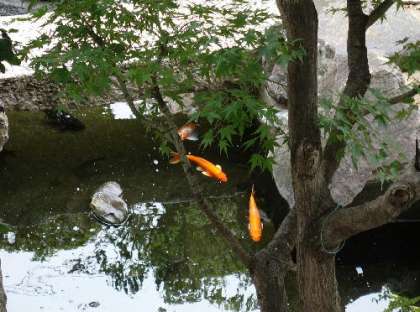 校内を回っていて、今宮の森にある、池に大きな鯉が泳いでいるのが目に留まりました。