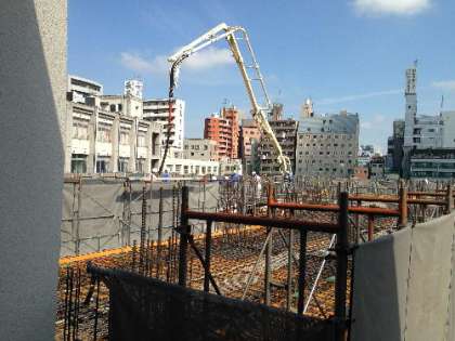 朝一番からコンクリートミキサー車が続々と来ています。いよいよ2階部分への流し込みです。