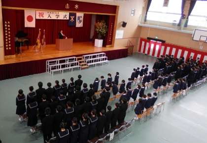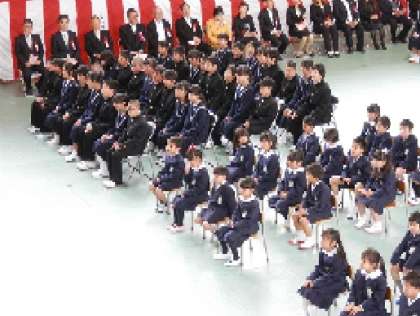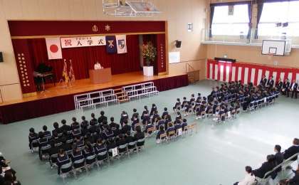 昨年度までは午前・午後に分けて実施していた入学式を、今年度は小中合同で実施しました。式場の中央に新1年生、その両側に新7年生が座っています。新1年生が、新7年生の姿にならって、しっかりとした様子を見せてくれていました。