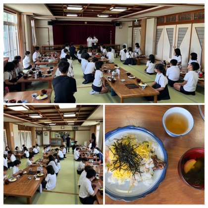 宿での開舍式の後は昼食です。献立は、ばら寿司のおすまし汁でした。普段あまり食べない児童も