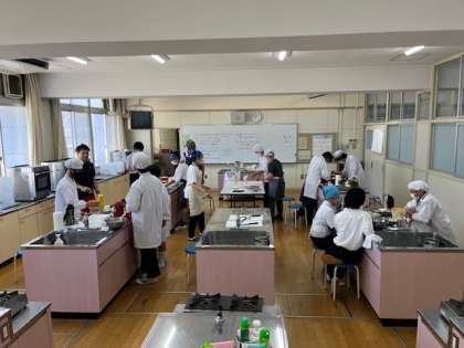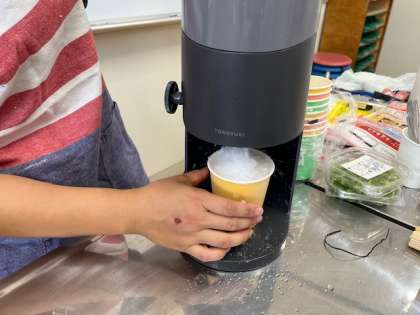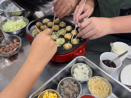 後半のお楽しみ会では、班に分かれてたこ焼きをつくって食べました。たこ焼きづくりに悪戦苦闘しながら、どの班も美味しいたこ焼きが焼き上がりました。コーン、チーズ、餅など、色々な具材がありました。デザートにはかき氷が用意されており、最後まで楽しく過ごしている参加生徒の表情が印象的でした。
