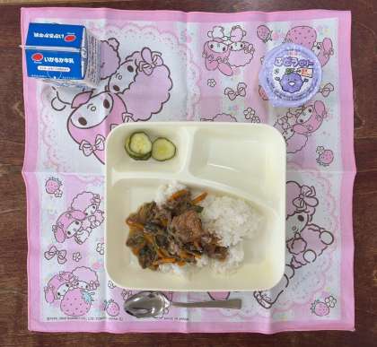 本日の献立は、マーボーあつあげ丼、きゅうりの中華あえ、ぶどうゼリー、牛乳です。