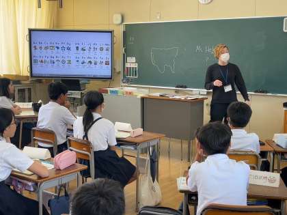 先生の自己紹介では、子どもたちがわかりやすい英語を使ってしました。先生が楽しく授業をしてくれるので、子どもたちは大きくうなずいたり、楽しく笑ったりしながら英語の授業を楽しんでしました。