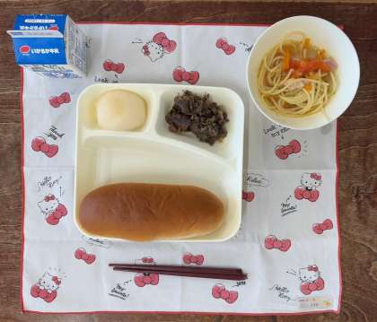 本日の献立は、黒糖パン、牛肉の香味焼き、トマトのスープスパゲッティ、和なしの缶詰、牛乳です。小学生は20世紀なしです。