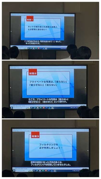 特に、ネット犯罪について動画や説明がありました。近年、ネッ友に会いに行くことで様々な被害にあっている事案が増えています。これらのことも踏まえて、ネットで知り合った見知らぬ他人とは容易に会わない、プライベートな写真は「撮らない」「撮らせない」「送らない」、フィルタリングを必ず利用しましょう、などについて子どもたちはしっかりと学んだようです。