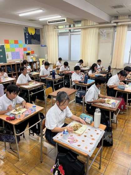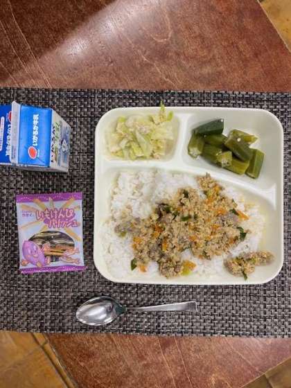 本日の献立は、他人丼、ささみとキャベツのいためもの、オクラの甘酢あえ、いもけんぴフィッシュ、牛乳です。