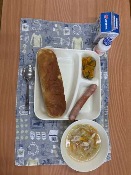 本日のメニューは、おさつパン、ウィンナーのケチャップソース、スープ、焼きカボチャ、発酵乳です。