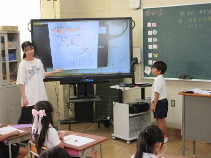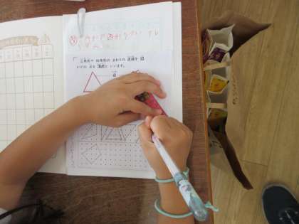 2時間目、2年生は算数科の「三角形と四角形」の学習に取り組んでいました。三角形には3つの頂点や辺があること、四角形には4つの頂点や辺があることを学びました。最後に、ものさしを使っていろいろな形の三角形や四角形をかいていました。たくさん手を挙げてとても楽しそうに学習に取り組んでいました。