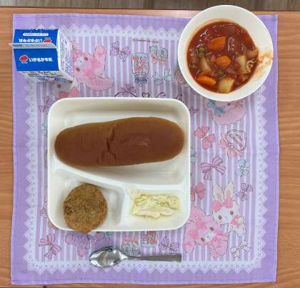 本日の献立は、黒糖パン、チキンレバーカツ、ケチャップ煮、キャベツのバジル風味サラダ、牛乳です。