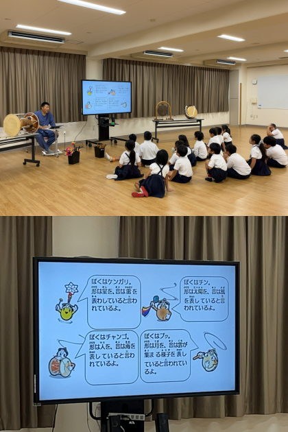 民族講師の先生が、チャンゴ、プッ(本来は半角のク)、チン、ケンガリについて説明してくださり、子どもたちは、それぞれの楽器は、形や音で自然の様々なものを表していることを知りました。