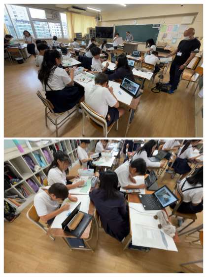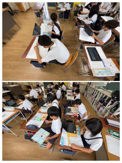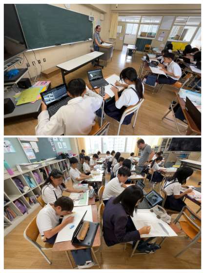 以前の授業までに、学習者用端末を使って校舎の風景を撮っており、その写真を見ながら水彩絵の具を使って描いています。