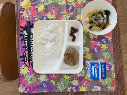 本日の献立は、ご飯、和風ハンバーグ、五目汁、金時豆の煮物です。