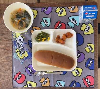 本日の献立は、ミ黒糖パン、まぐろのオーロラ煮、スープ、さんどまめとコーンのサラダ、牛乳です。