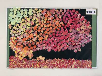小学校すまいる学級の10月の作品がピロティそばの掲示板に展示されています。