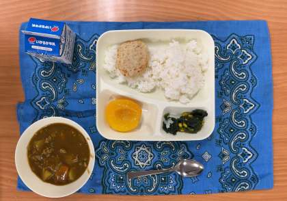 本日の献立は、ポークカレーライス、ほうれんそうのソテー、黄桃の缶詰、牛乳です。中学生は焼きとうふハンバーグがつきます。