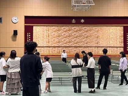 明日の芸術鑑賞に向けて、バドミントン部の生徒と教職員で会場設営を行いました。