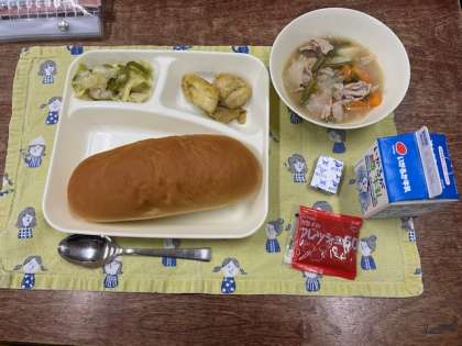 本日の献立は、コッペパン、いちごジャム、鶏肉のカレー風味焼き、スープ煮、