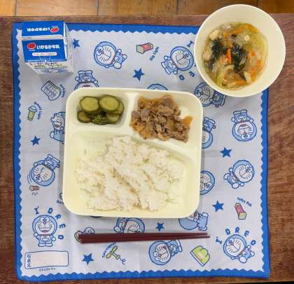 本日の献立は、ごはん、豚肉のコチジャンいため、鶏肉とはるさめのスープ、きゅうりのナムル、牛乳です。