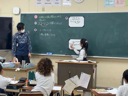子どもたちは初めに、小数の計算の仕方を、0.1がいくつ分あるのかを考える方法と、小数と整数に分ける方法について考えました。