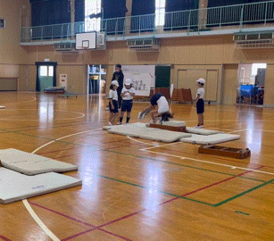 子どもたちは、「マットの上やったらできるのに」「跳び箱の上でやったら怖いなぁ」と言いながら、先生の太鼓のリズムに合わせて練習をしていました。