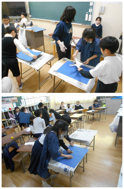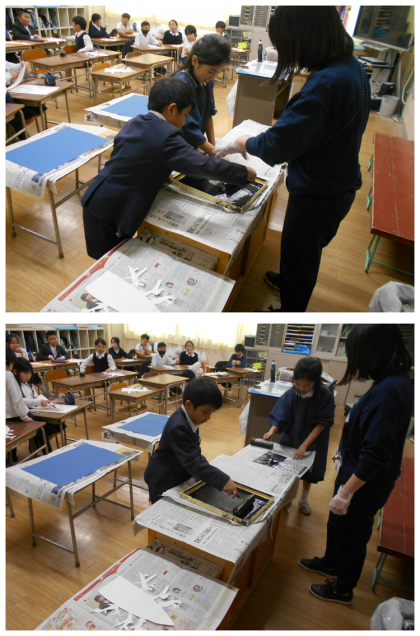子どもたちは、自分たちが厚紙で作った様々なものに、ローラーを使ってインクを塗りました。そして、手にインクがつかないようにそっと持ち上げて色画用紙に乗せ、その色画用紙をひっくり返してバレンでこすりました。最後に、インクが付いている厚紙を取り外すと作品が完成です。完成した作品を見て、子どもたちは喜んでいました。