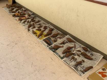 今、そのおいもは、教室の前で乾燥させています。おいもは乾燥させると甘みが増えます。12月5日に焼き芋体験をしますが、その日まで干します。
