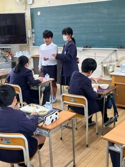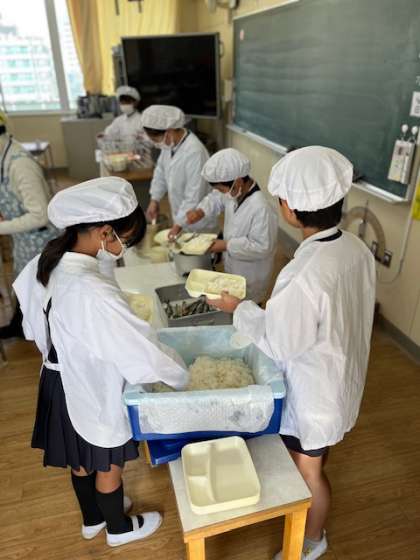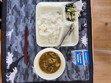 本日の献立は、ごはん、焼きししゃも、和風カレー汁、ささみと小松菜の炒めもの、牛乳です。カレーのいい香りが、食欲をそそりました。子どもたちは美味しそうに給食を食べていました。