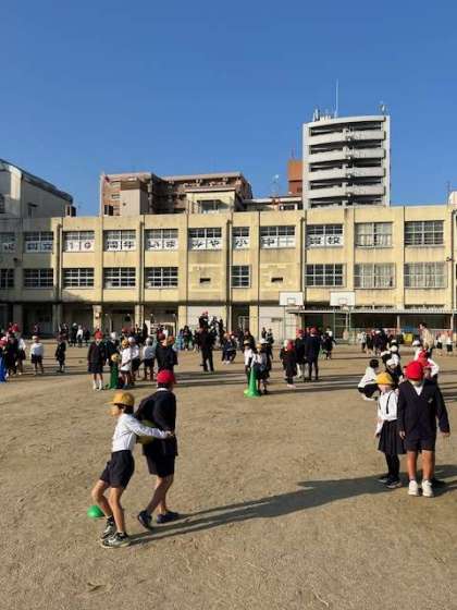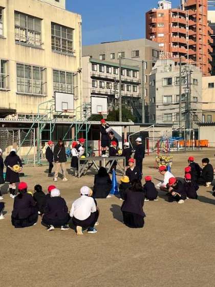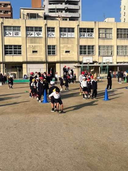今日の児童集会はたてわり班でボール運びリレーを行いました。班の友達と背中合わせにボールを運び、ボールを落とさないようにコーナーを回って上手に運んでいました。高学年と低学年が仲良く協力して活動することができました。