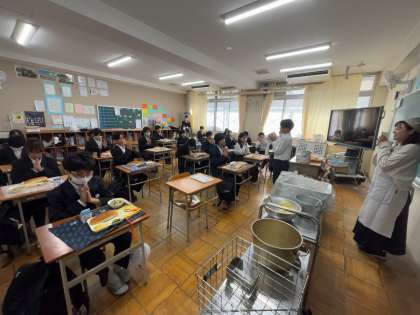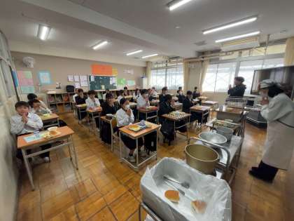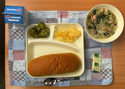 本日の献立は、コッペパン、ソフトマーガリン、鶏肉ときのこのシチュー、きゅうりのピクルス、パインアップルの缶詰、牛乳です。小学生は、パインアップルの缶詰が富有柿になります。