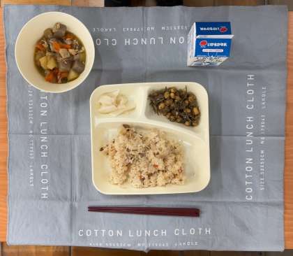 本日の献立は、ご飯、鶏肉と野菜の煮もの、じゃこ豆、かぶのゆず風味、牛乳です。中学生は、ご飯がかやくご飯になります。