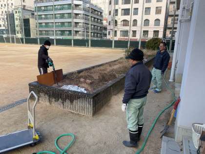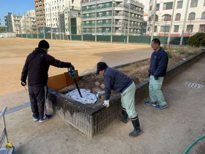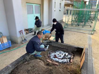 子どもたちから預かったおいもを、いい火加減になった焚火の中に入れていきます。