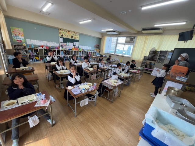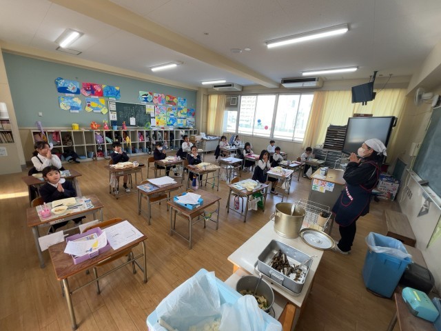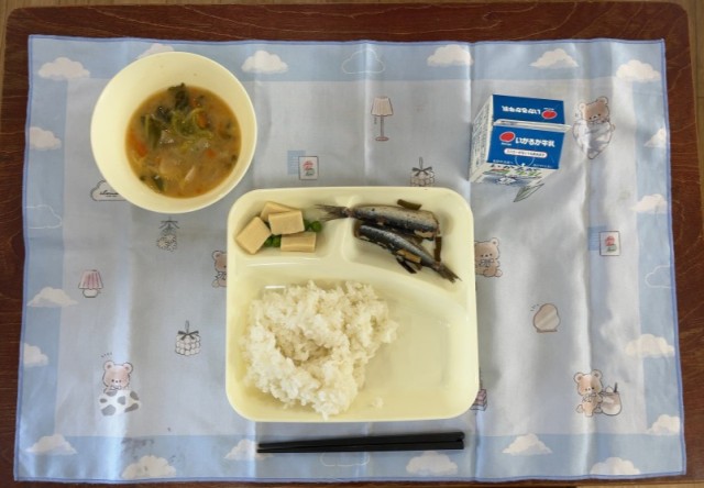 本日の献立は、ごはん、いわしのしょうが煮、みそ汁、高野どうふの煮もの、牛乳です。中学生は焼きのりがつきます。