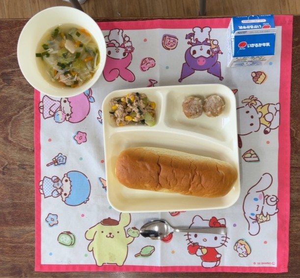本日の献立は、おさつパン、焼きシューマイ、中華スープ、ツナとチンゲンサイのいためもの、牛乳です。