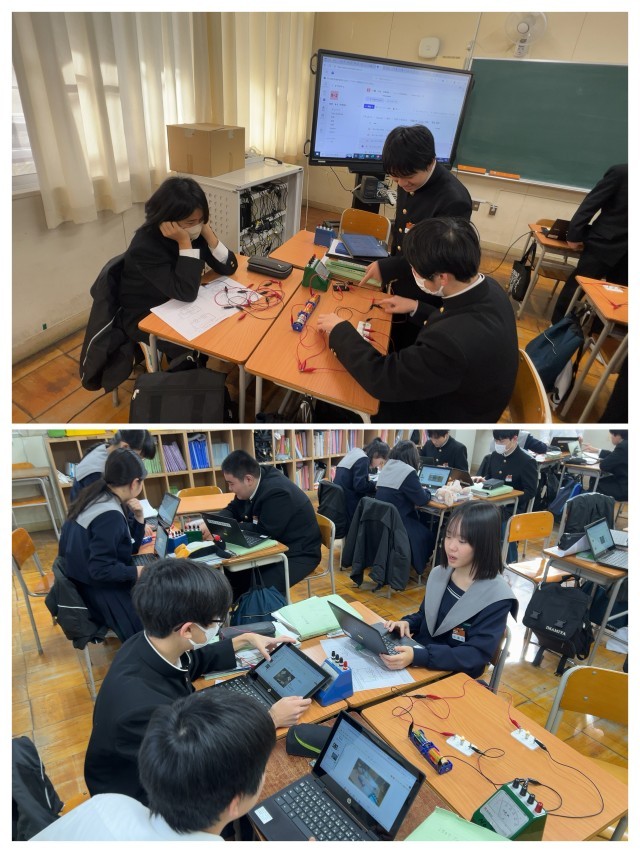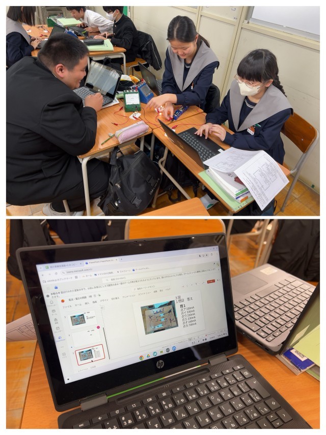 子どもたちは今まで習った電気回路の電圧と電流、直列回路、並列回路を組み合わせながら、それぞれの班で問題を作っていました。