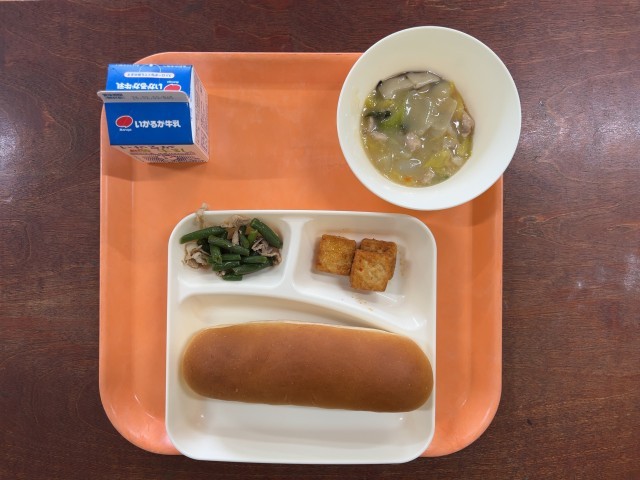 本日の献立は、黒糖パン、はくさいのとろみ煮、あつあげのピリ辛じょうゆかけ、豚肉とさんどまめのオイスターソースいため、牛乳です。
