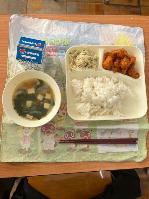 本日の給食メニューは、ごはん、ヤンニョムチキン、とうふのスープ、切り干し大根のナムルです。