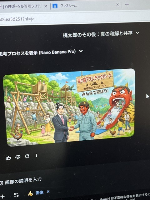 ICT支援員さんを講師に「やってみよう、生成AI」というテーマでメンター研修を行いました。「ももたろう」を題材に、生成AIを使って現代風の新しい物語を作りました。指導者が「何をしてほしいか」を伝えるための指示や質問文を入力し、プロンプトを作成していました。これからの教育活動に生かせたらと思います。