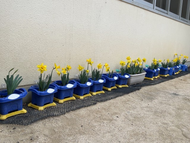 2年生が植えたラッパスイセンが、この3連休で一気に花が咲きました。